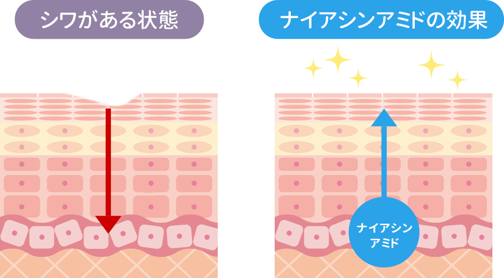 ナイアシンアミドにより、生成促進されたコラーゲンやエラスチンが肌の奥から凹んだ肌を